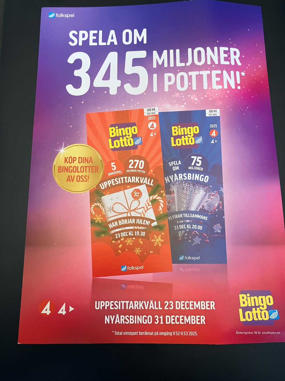 Nu är det dags att skaffa bingolotter till jul och nyår. Till båda helgerna finns lotter för både 100 och 200 kronor.